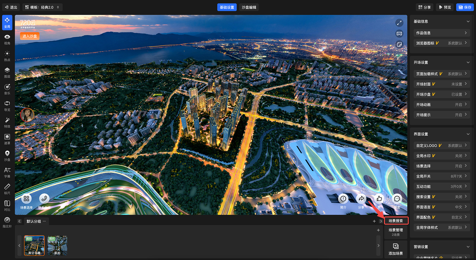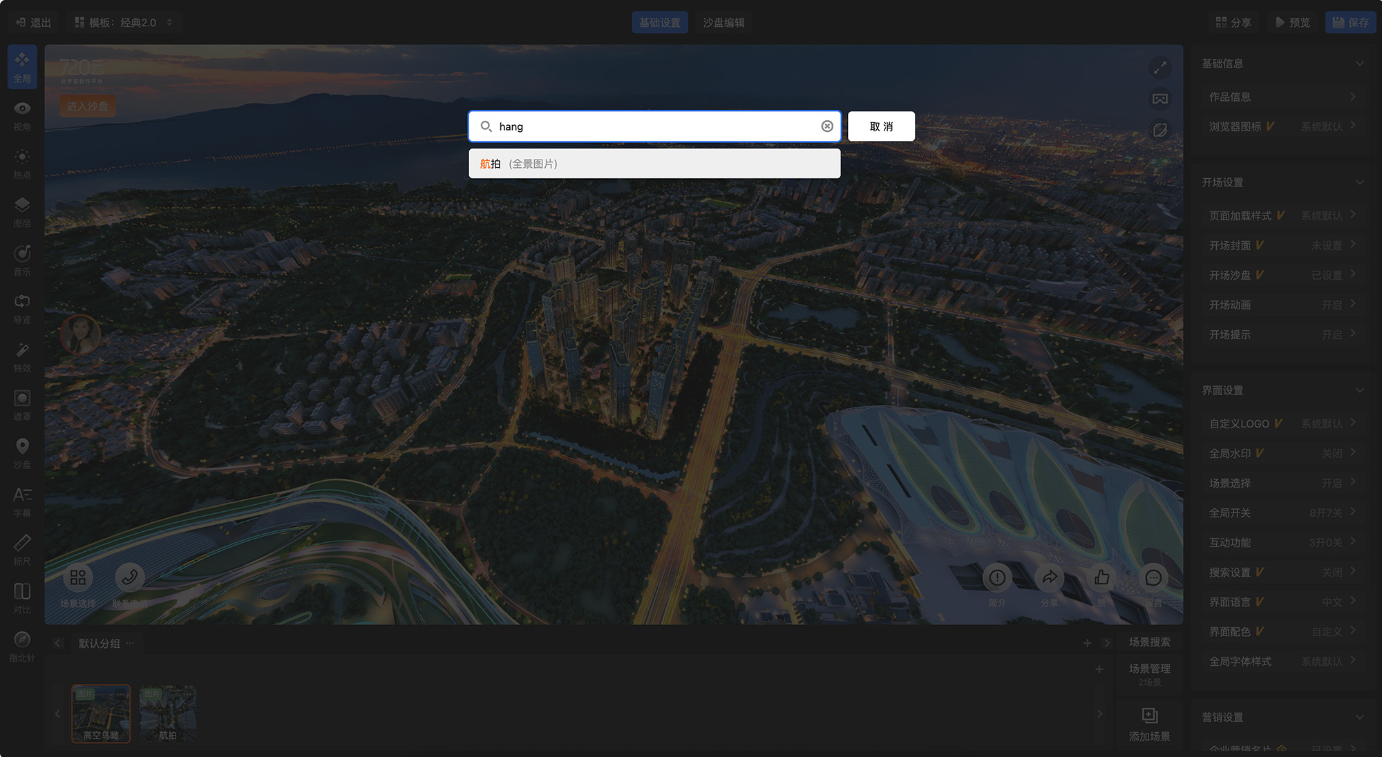 720漫游编辑器场景管理栏中新增【场景搜索】功能,点击弹出搜索查询栏,输入关键词可以快速检索查询相关的场景/一级分组/二级分组,点击相应场景/一级分组/二级分组名称可以快速切换并定位到对应的场景/一级分组/二级分组,可以作品编辑查询效率。