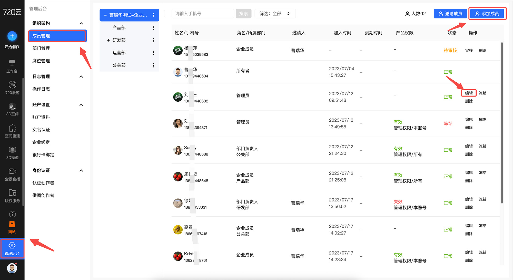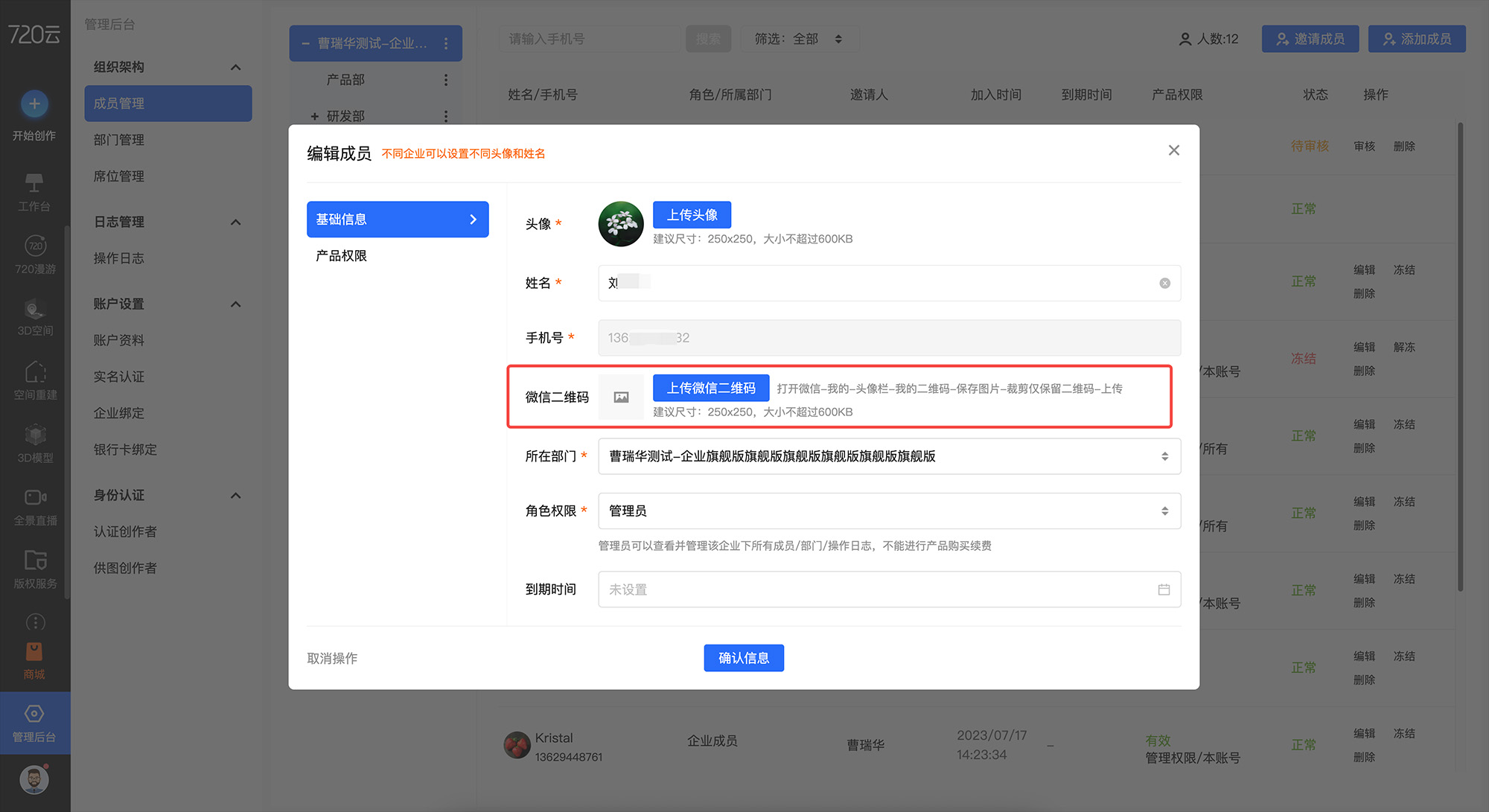 720云工作台-管理后台-成员管理中添加/编辑成员时,新增支持设置成员的微信二维码图片,设置的二维码在使用720漫游【企业营销名片】功能时,将会呈现出来以便潜在客户可以添加相应企业成员的微信。