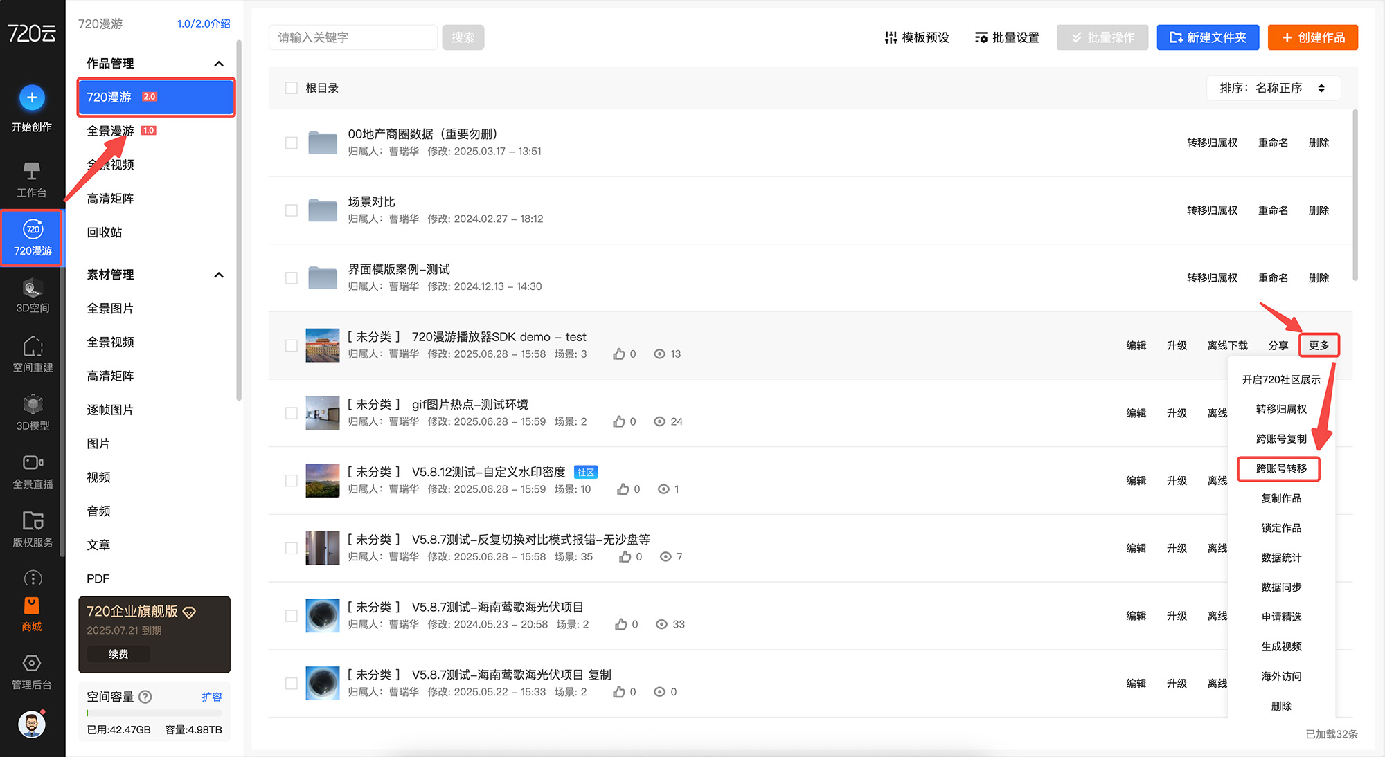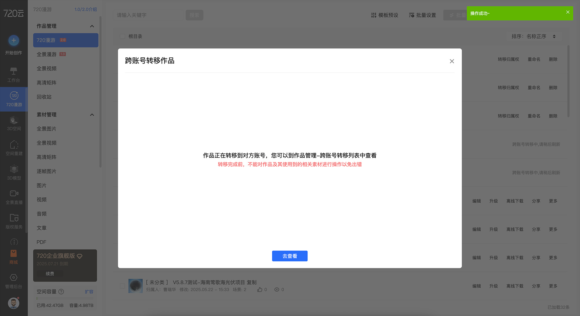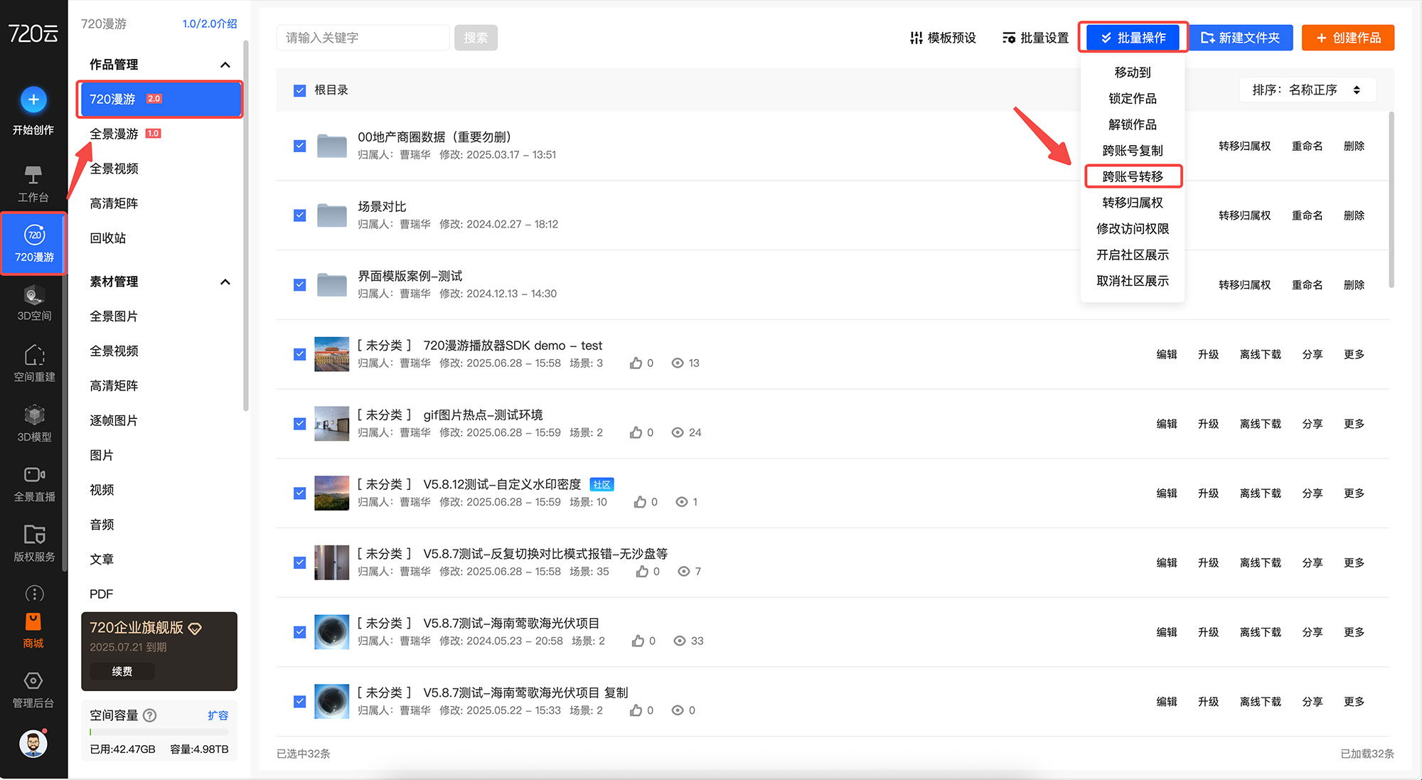 720漫游作品列表中更多操作和批量操作中新增“跨账号转移”功能,支持将当前账号中的作品跨账号转移到其他账号,转移后访问原作品地址将自动重定向到新的转移后的作品地址。保证作品的访问地址“不变”。