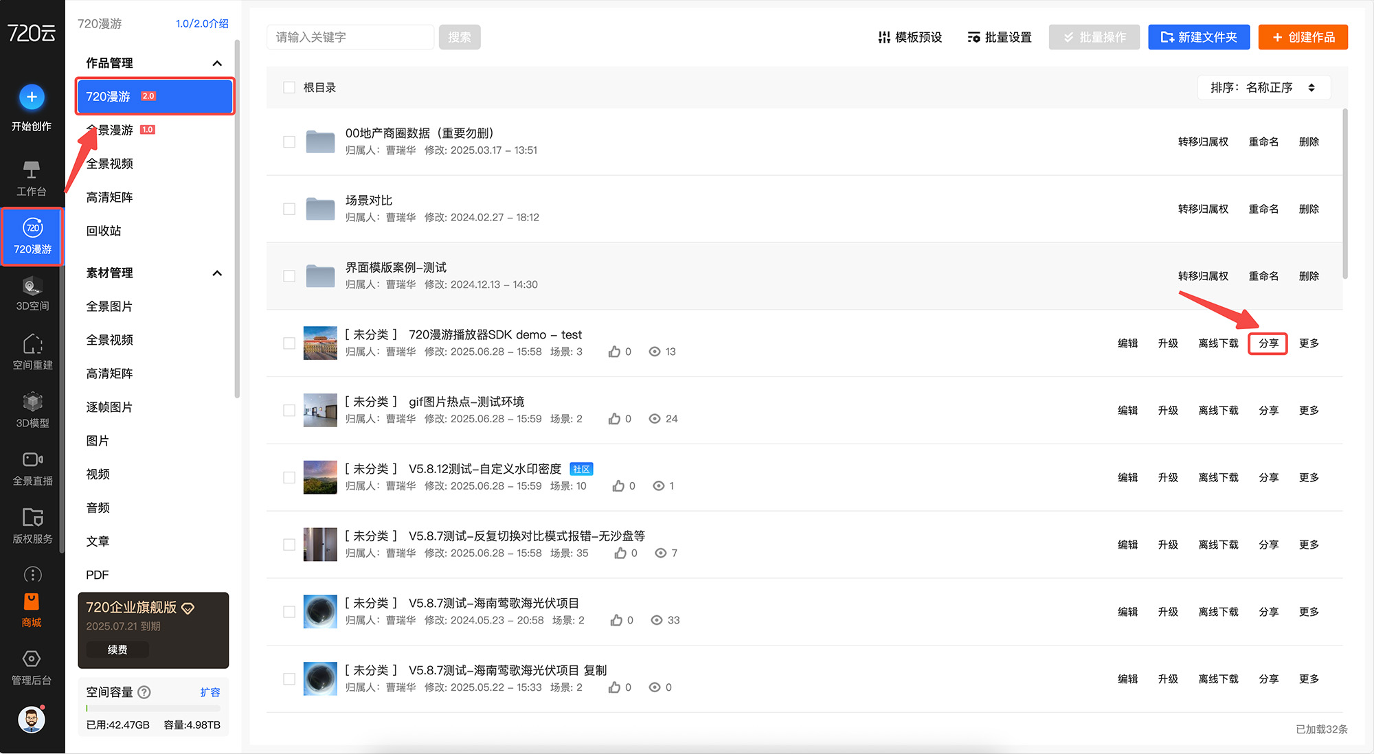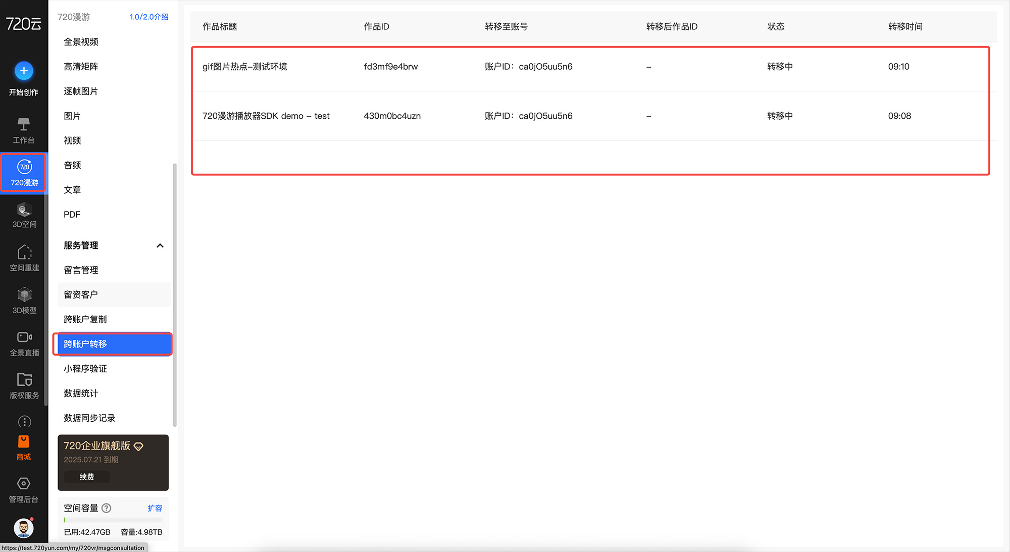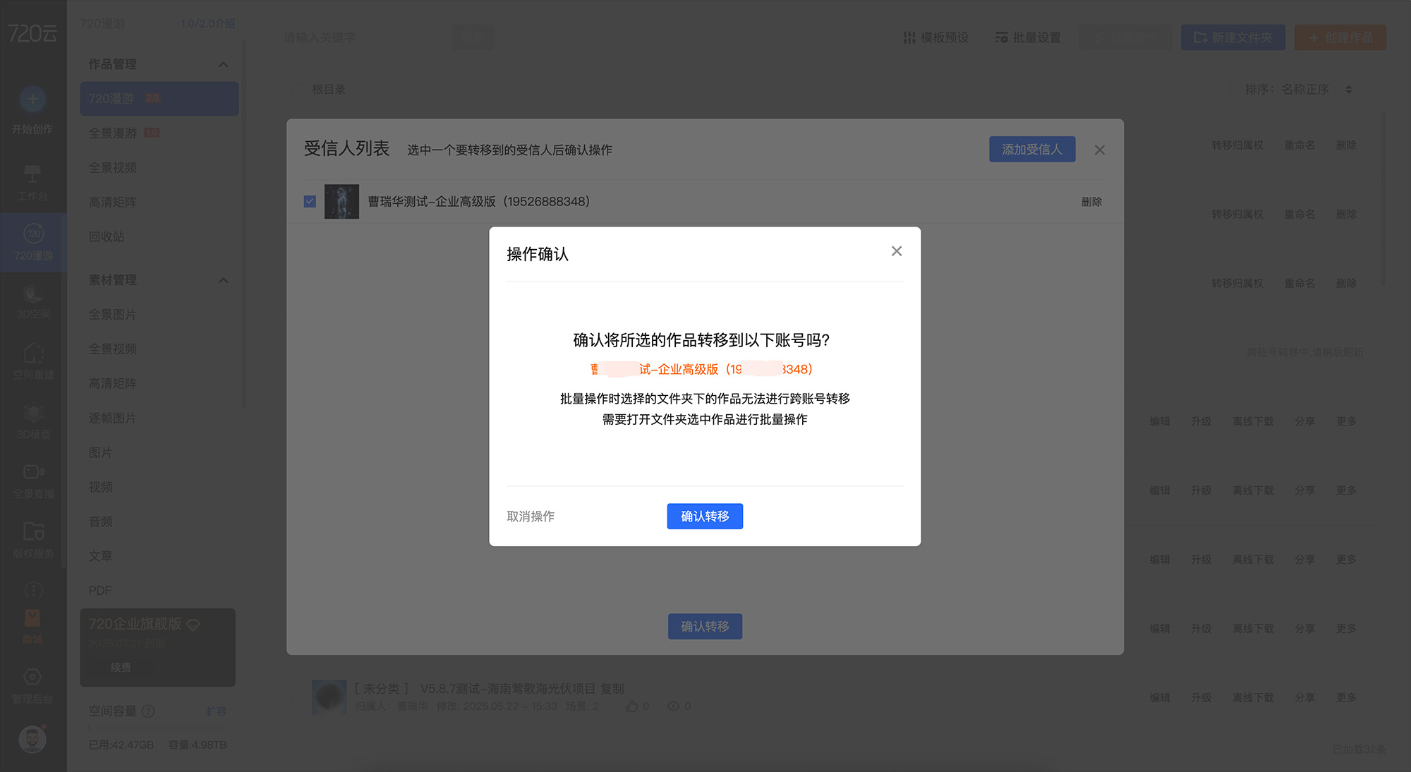 720漫游作品列表中更多操作和批量操作中新增“跨账号转移”功能,支持将当前账号中的作品跨账号转移到其他账号,转移后访问原作品地址将自动重定向到新的转移后的作品地址。保证作品的访问地址“不变”。