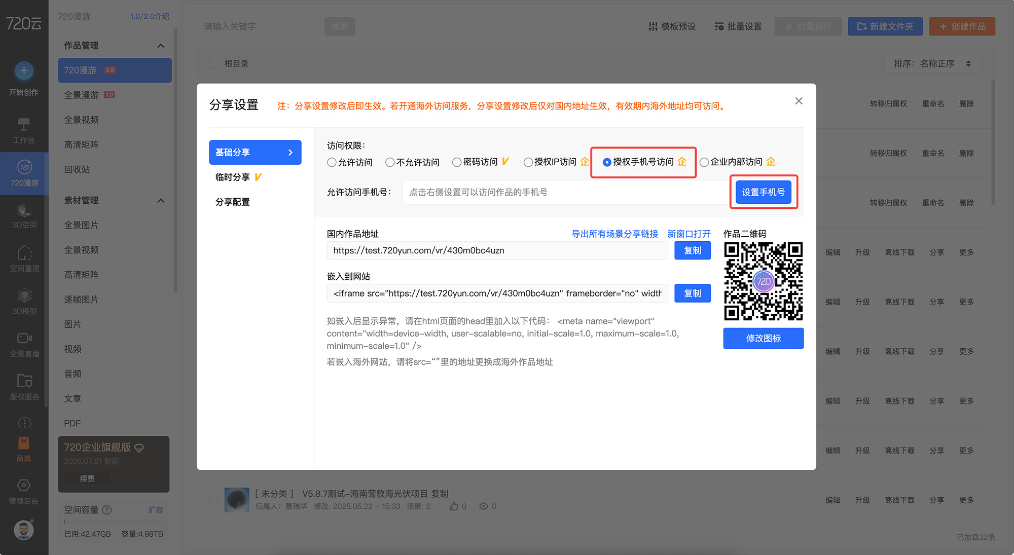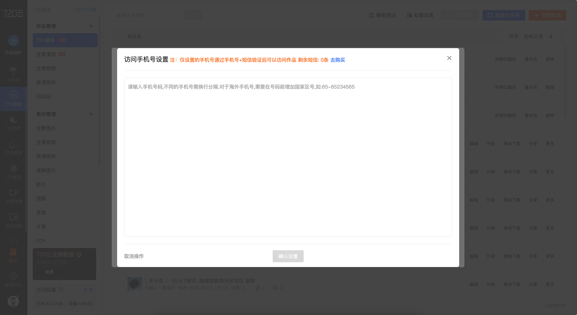 720漫游作品分享设置-访问权限新增【授权手机号访问】,选择授权手机号访问时,可以自定义设置可以访问作品的手机号码,设置后,当用户访问作品时,需要进行手机号+短信验证码验证成功后方可查看作品。