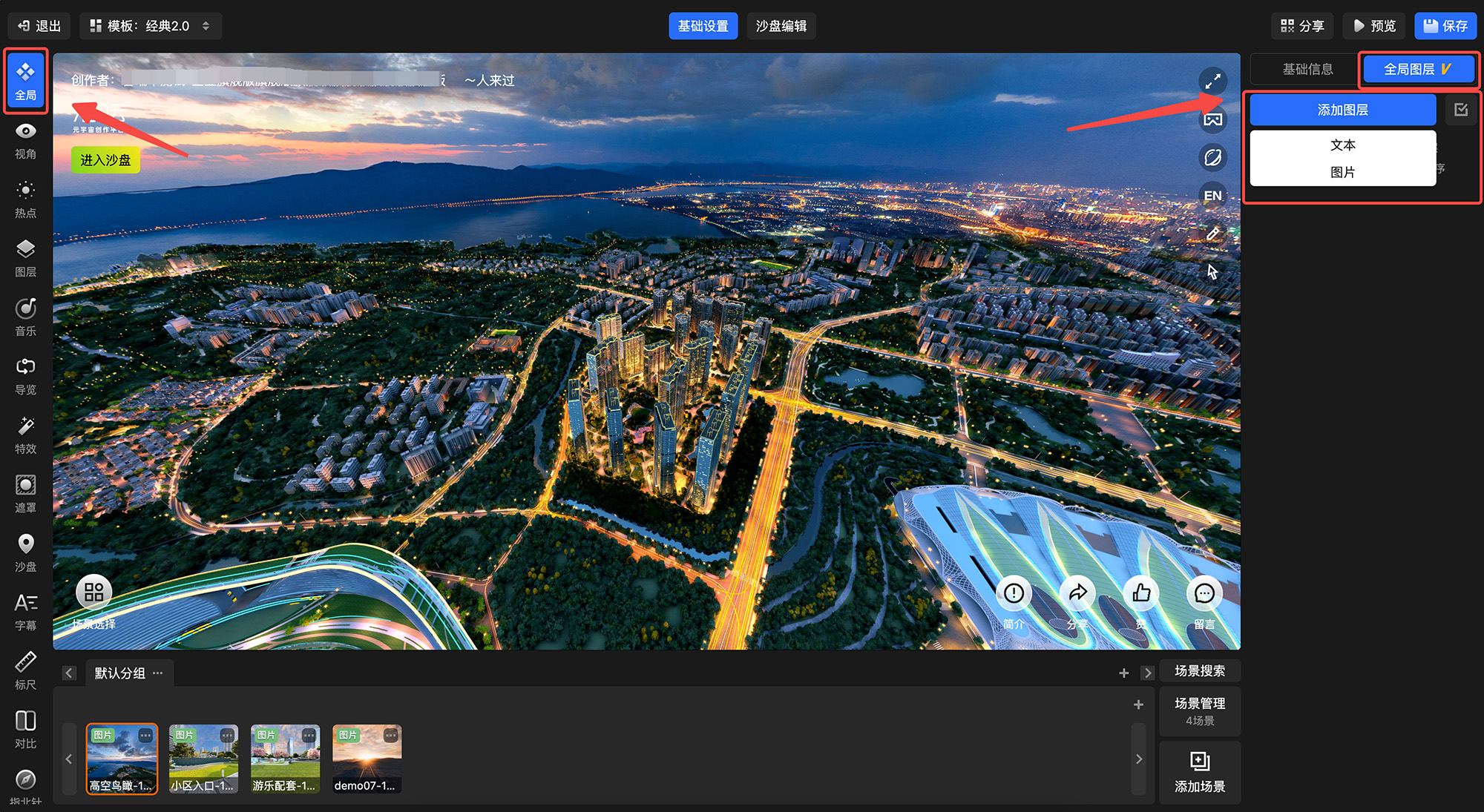 720漫游全局设置新增【全局图层】功能,点击“添加图层”,可以选择【文本】或【图片】进行文本图层或图片图层的添加。