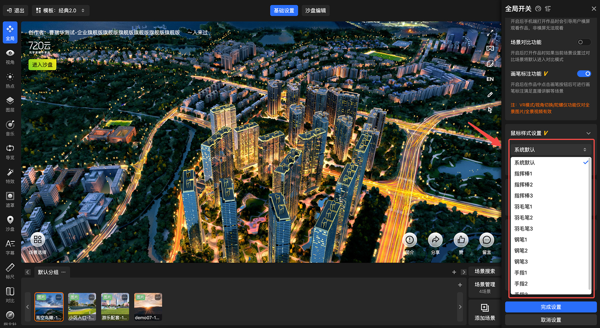 720漫游全局设置-全局开关中新增【鼠标样式】功能,可以选择系统默认/指挥棒/羽毛笔/钢笔/手势共计13种鼠标手势,同时也支持开启“鼠标样式切换”功能开关,开启后在播放器端,观看用户可以自主选择鼠标的样式;