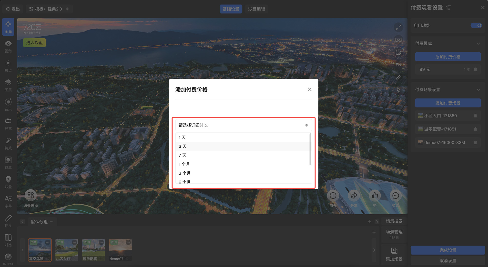 720 漫游【全局设置-营销设置-付费观看设置】功能迎来优化升级!现在支持添加多种付费订阅模式,创作者可自定义4个付费套餐供用户选择,订阅时长覆盖1天、3天、7天、1个月、3个月、6个月、1年、2年、3年至终身等多档选项。