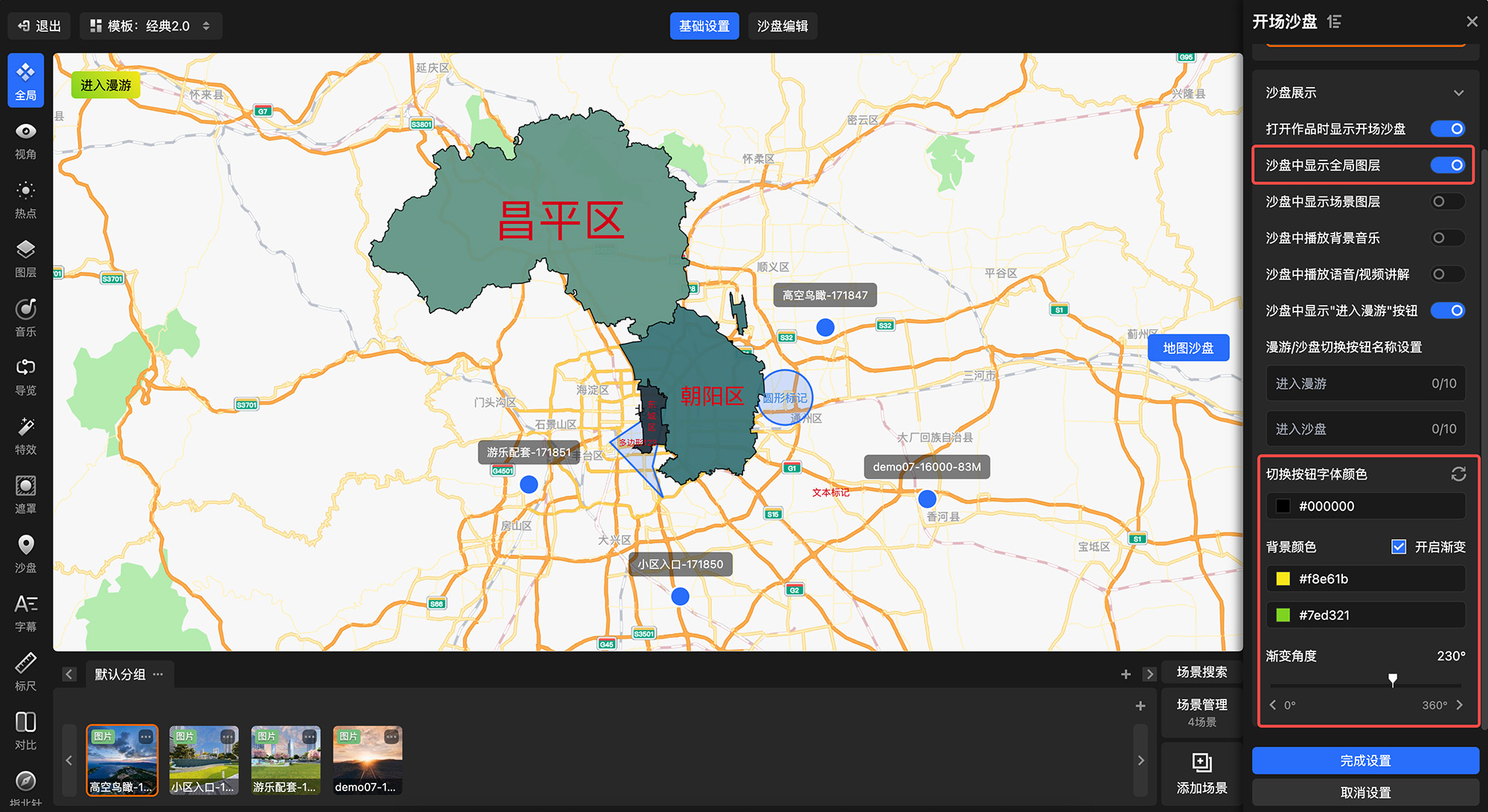 · 新增支持设置【进入沙盘/进入漫游】按钮的字体颜色和背景颜色,背景颜色支持设置纯色和渐变色,最大化满足个性展示需求。