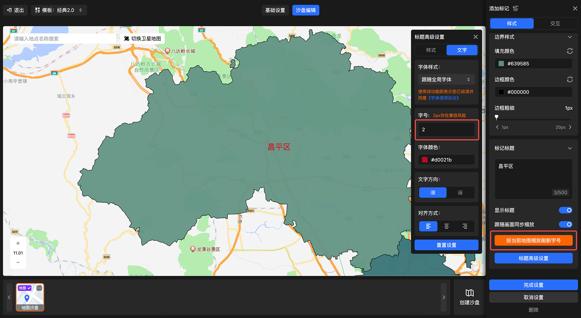 更实用的是,当开启 “跟随画面同步缩放” 时,文本与标记标题新增【按地图当前缩放调整字号】功能 —— 点击对应按钮,字体大小会匹配当前地图的缩放层级自动调整,让文字显示与地图标记始终保持协调适配,快速实现字体大小匹配所需标记。