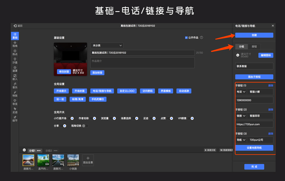 3、作品编辑⇒基础⇒电话、链接与导航:新增分组功能,菜单中最多支持3个按钮/分组,分组内最多支持5个子按钮,按钮最大数量从原来的3个直接提升到15个,看图: