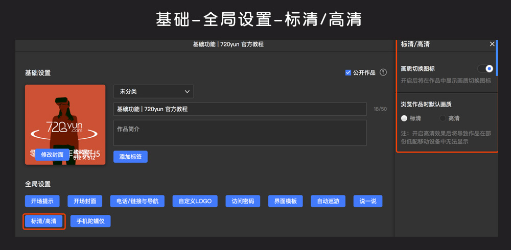 4、作品编辑⇒基础⇒全局设置⇒标清/高清,可以设置移动端默认加载的图片清晰度(标清/高清),但是,请慎重设置默认加载高清,部分低端机型会因此崩溃!