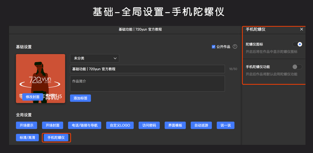 5、作品编辑⇒基础⇒全局设置⇒手机陀螺仪,默认显示“陀螺仪”按钮,不开启“陀螺仪”功能;你可以根据自己的喜好来进行设定哦~