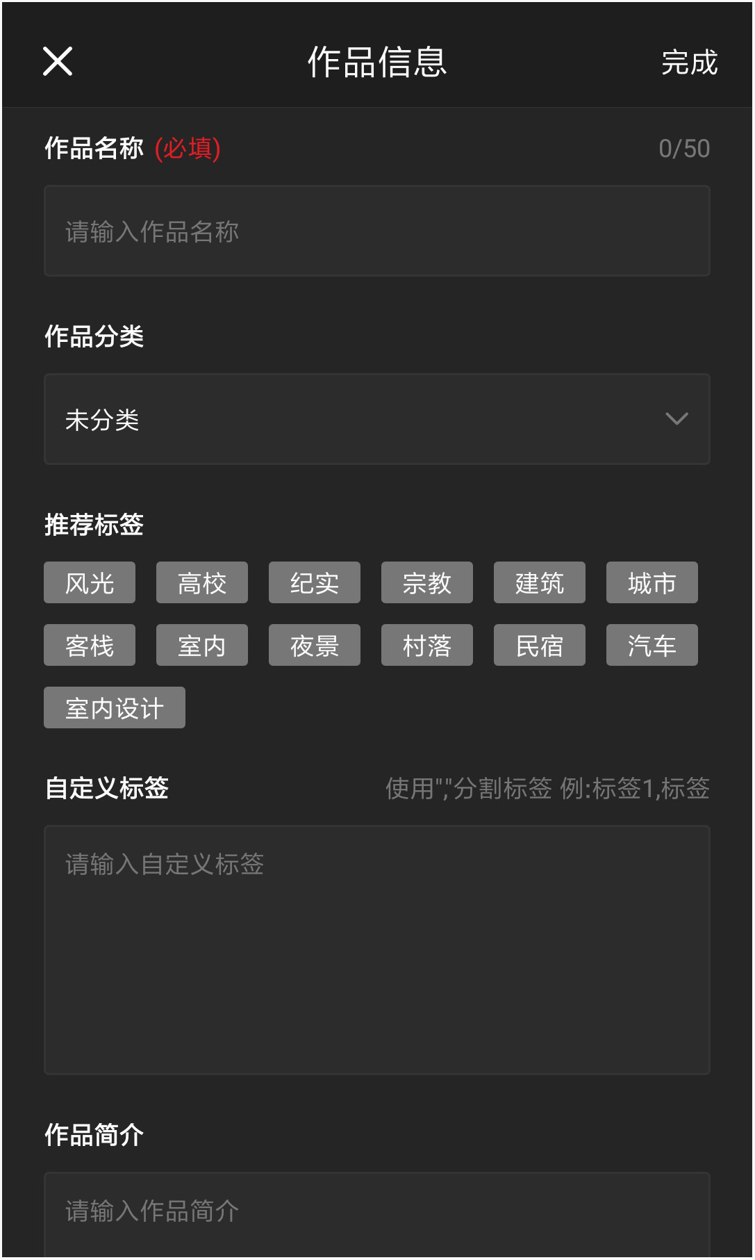 作品分类: 合适的分类有助于您高效管理并推广作品。同时有助于其他用户快速搜索到您的作品,以及平台推广您的作品到更多的流量平台哦~