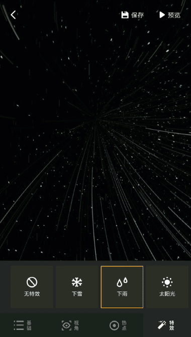 特效: 多种特效(下雪、下雨、太阳光等)可在App 内直接选择并保存,实时预览。