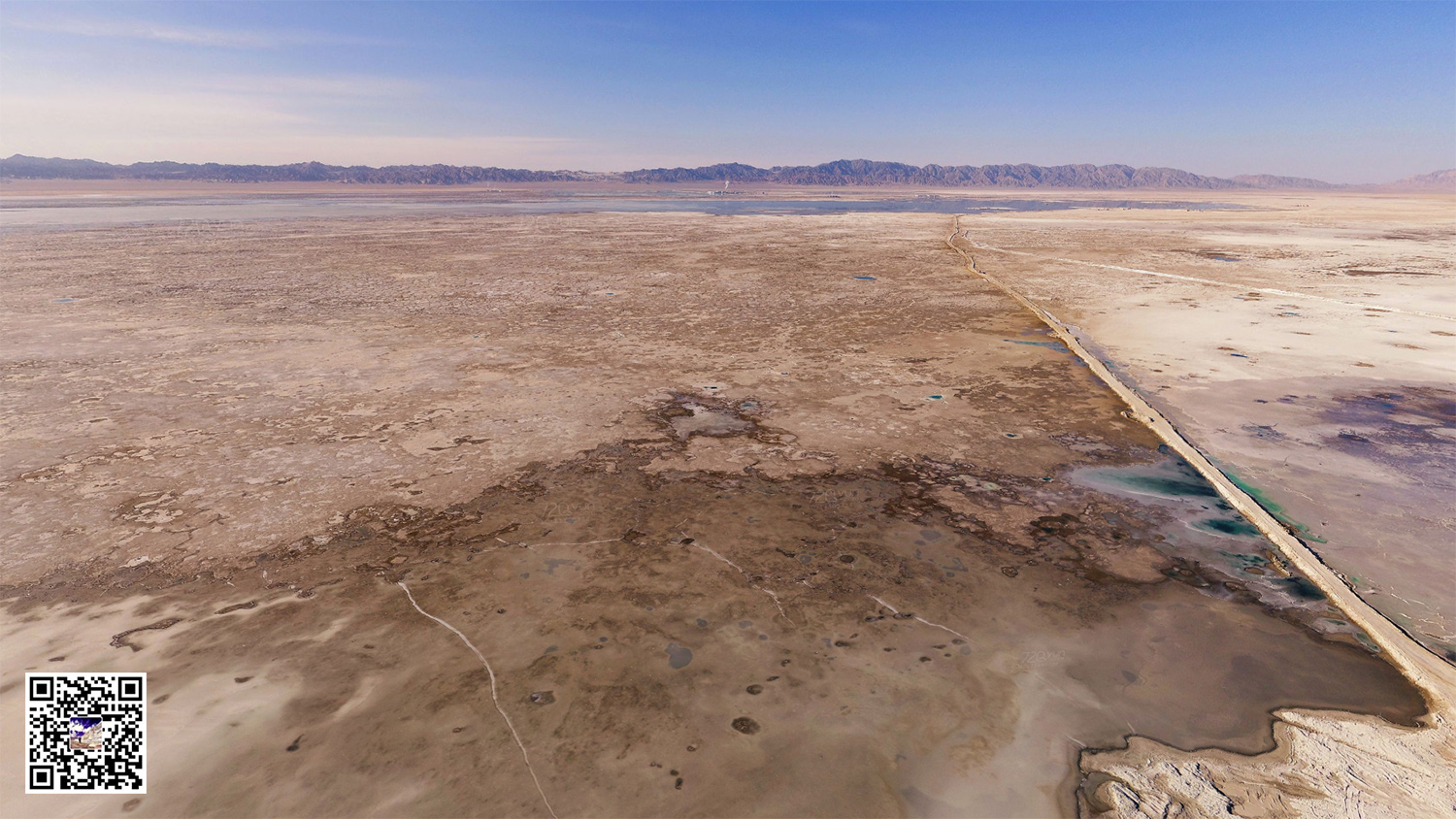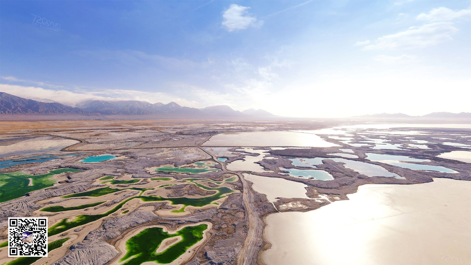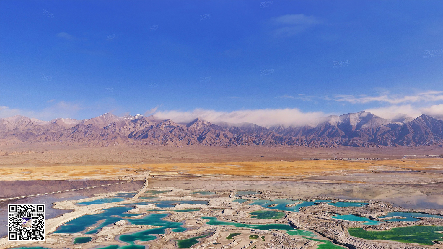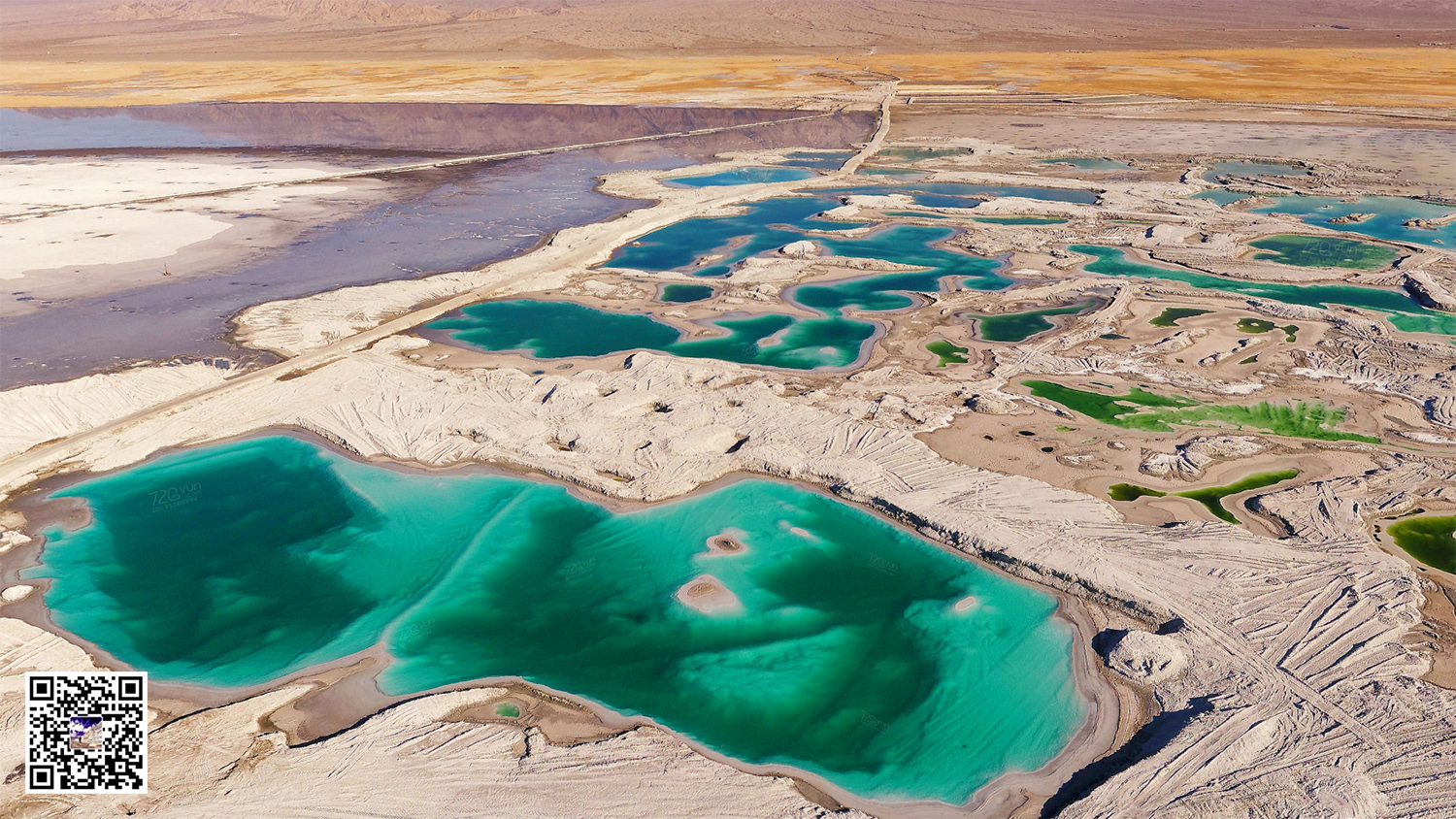 这片形态迥异的盐池是历经多年的盐湖开采而形成的采坑,由于所含矿物质浓度不同,湖水呈现出多彩的景象,深绿、墨绿、翠绿……宛若镶嵌在大地上的一块块翡翠,因此它才有了“翡翠湖”这个美称。