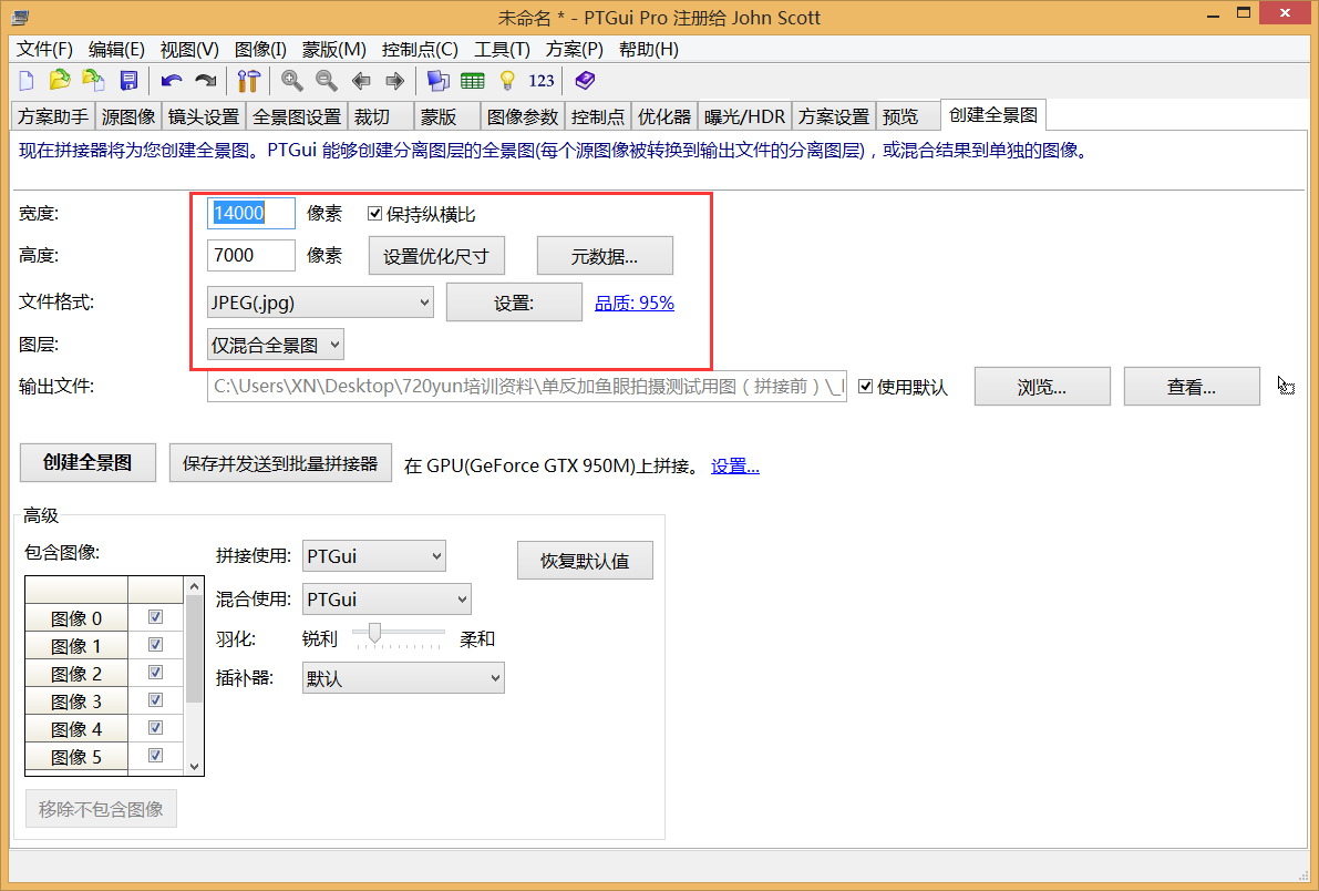 第九步:创建全景图设置长宽比2:1,一般宽在12000-15000,分辨率240(主流),品质100%,保存方案(crtl+S),保存模板(crtl+alt+T),默认名称位置即可。