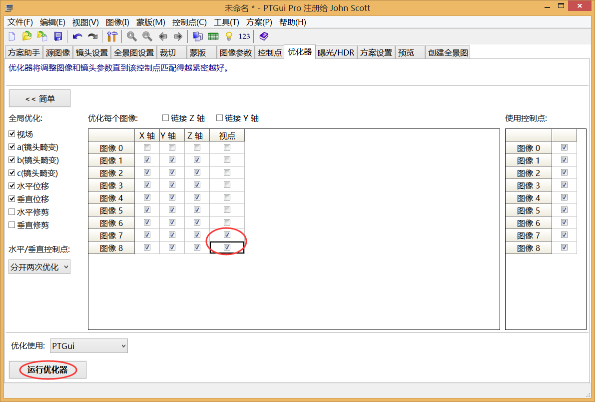 第三步:运行优化器(快捷键F5)后,查看控制点列表(快捷键ctrl+B),删除(快捷键delete)距离较大的控制点(一般10以上),再次按F5运行优化器。