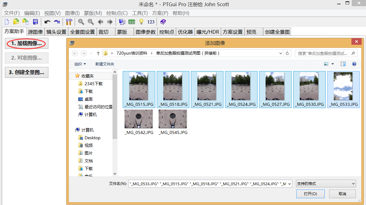 第一步:加载图像,把拍摄水平一周和天空的照片放到PTGUI中,最后两张地面图片暂时不放。(拍摄时采用了外翻补地2张,节点位置发生了变化,故暂时不放入)